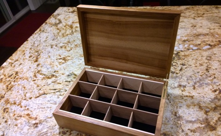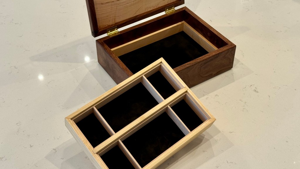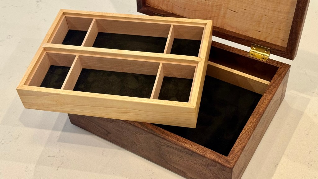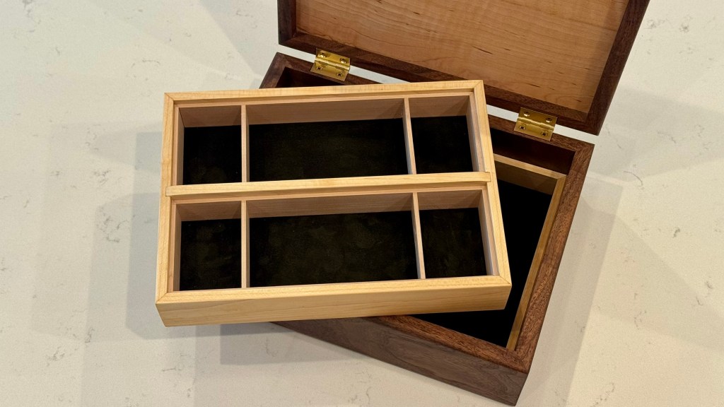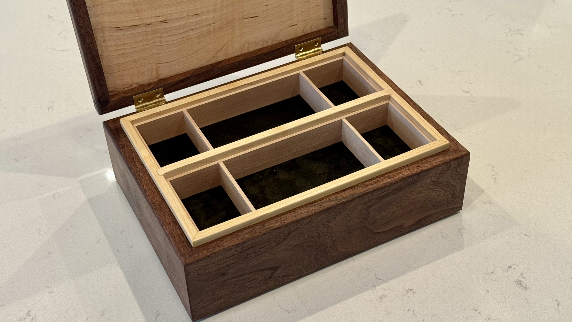 The top tray is perfectly fitted to the main box, and features thin and sturdy quarter-sawn maple dividers. Both levels feature a wonderful-to-touch, dark green, real suede interior.