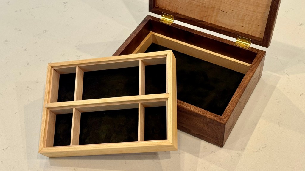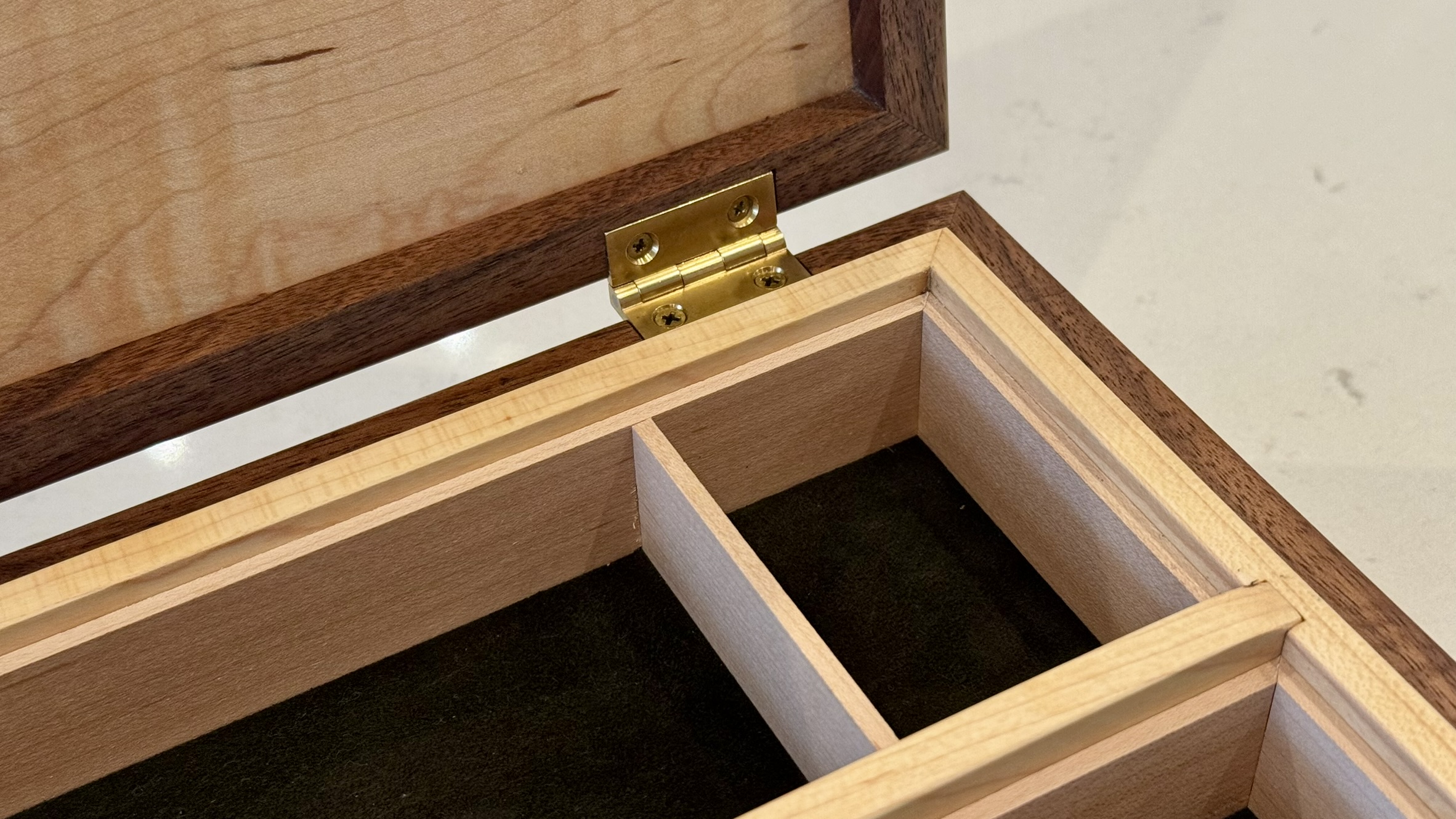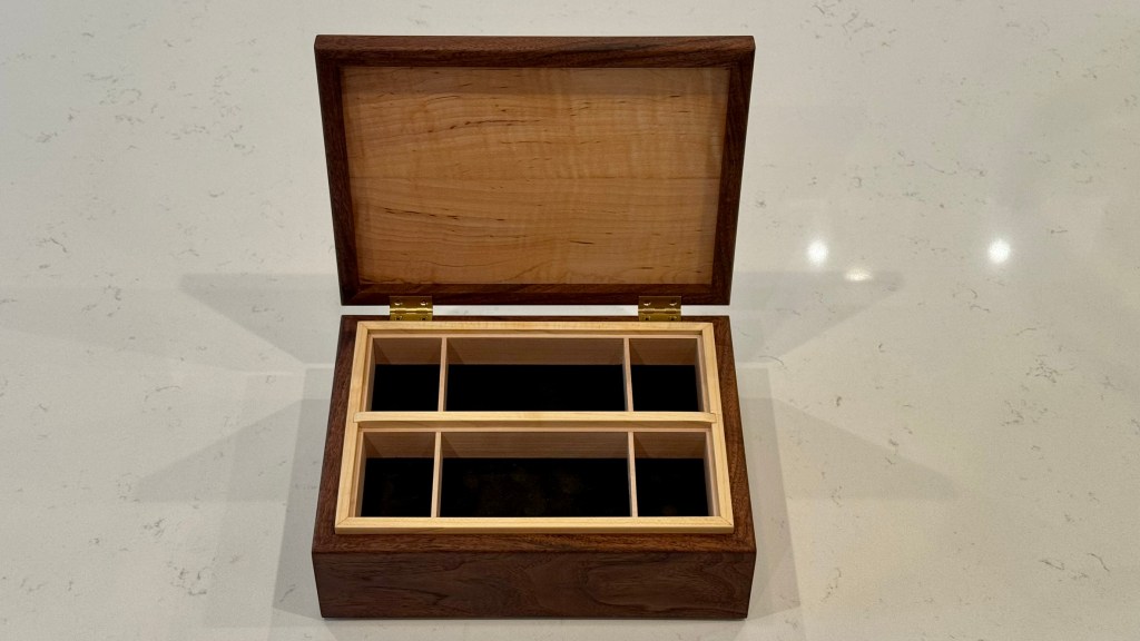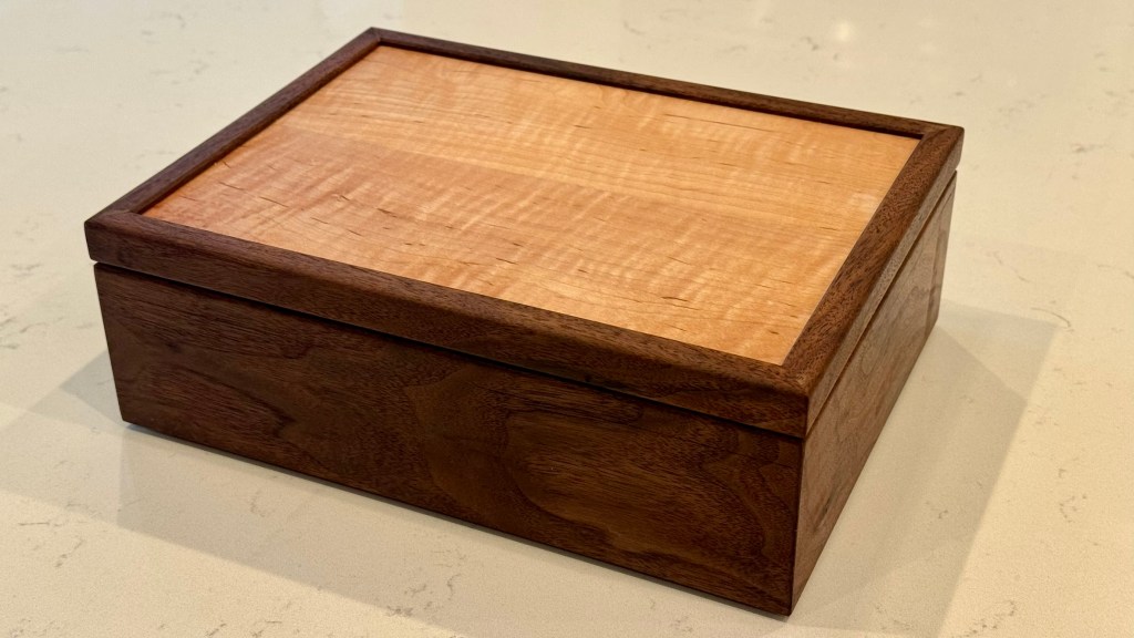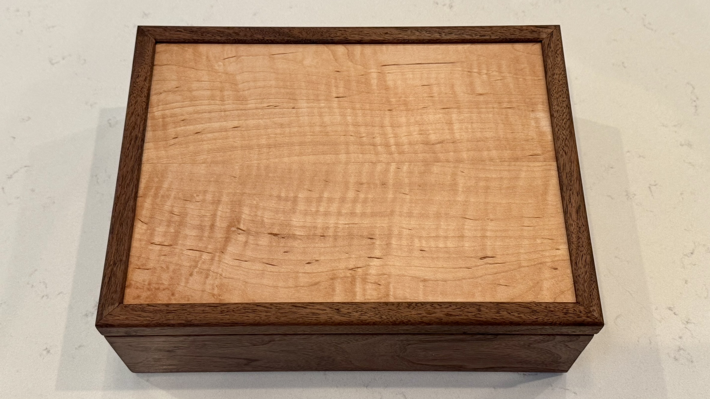 The highlight of this box is the book-matched beautifully figured curly maple top. I’ve been holding onto this piece of wood for decades, waiting for the right project. This is it!
