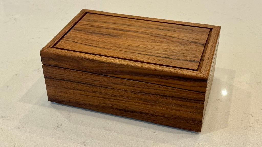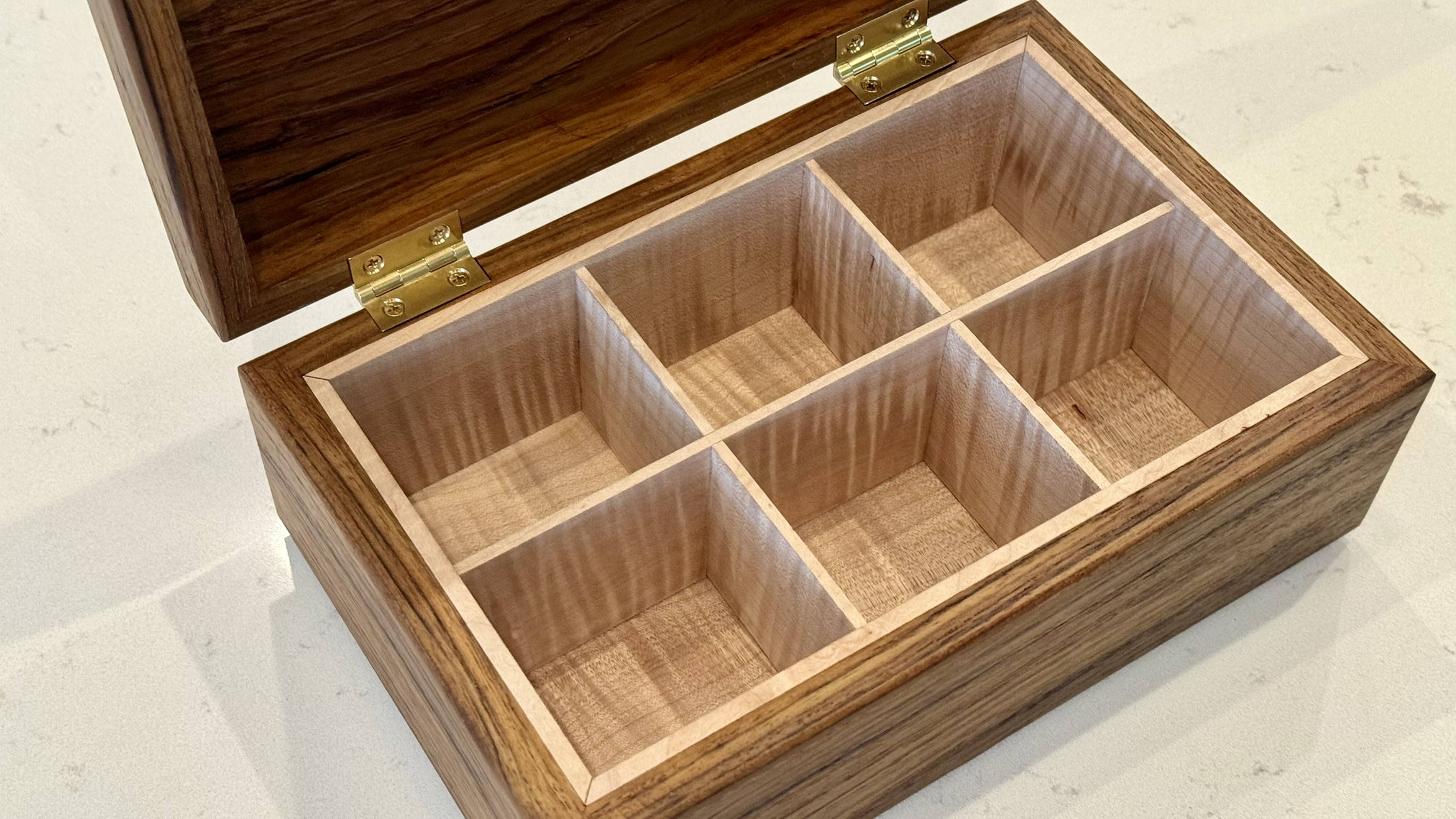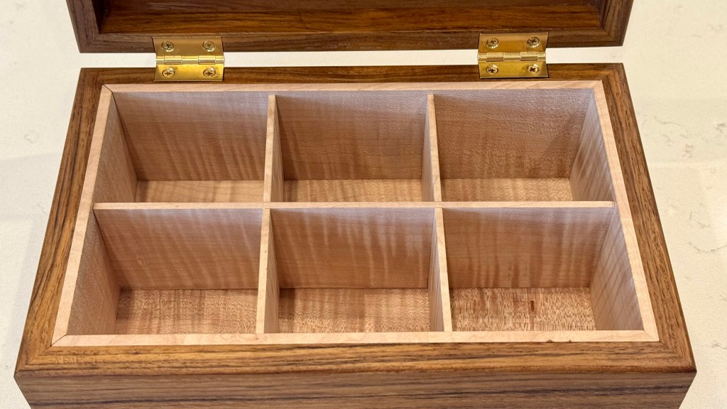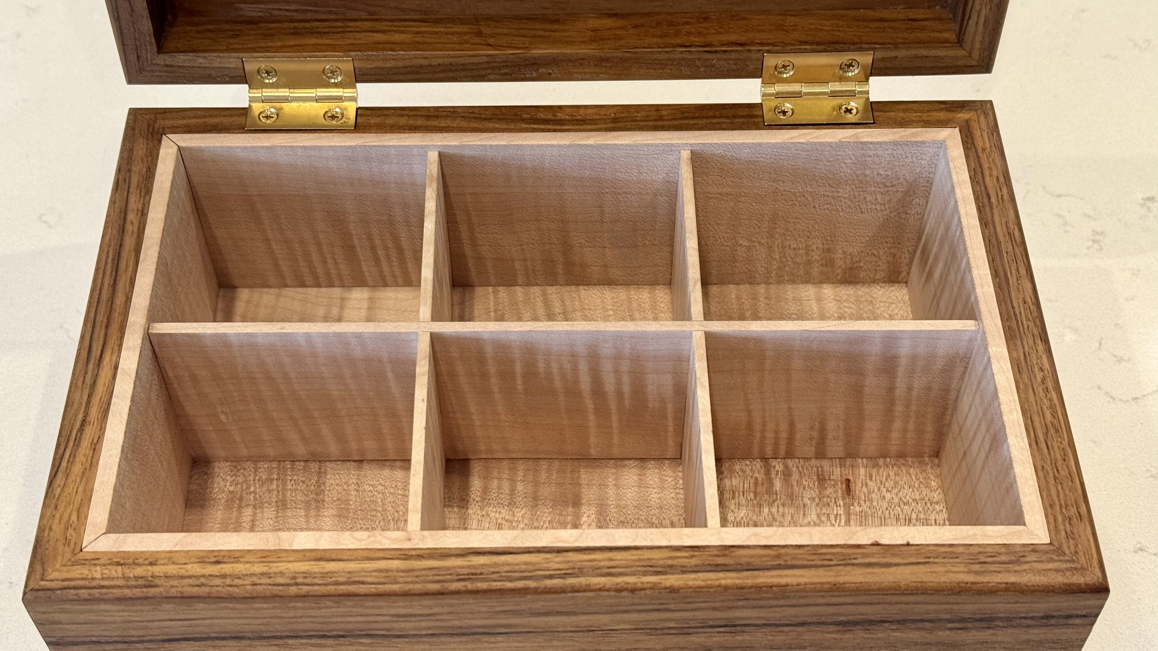 The real highlight of this piece is the curly maple interior. The bottom is lined with a hand-planed sheet of curly maple, and the dividers and side panels were all cut from the same board for a consistent grain and tone. I left the maple unfinished to preserve its natural texture—it’s silky to the touch and invites interaction.