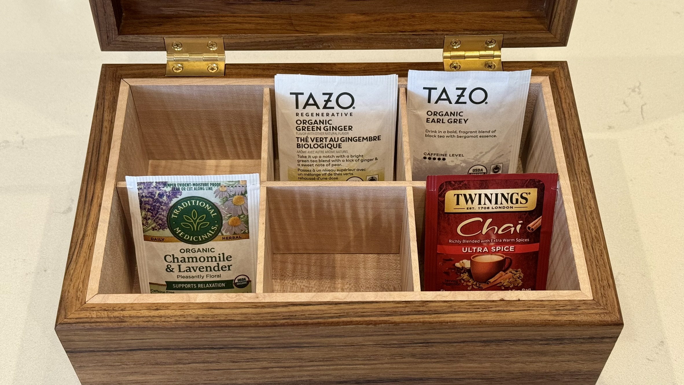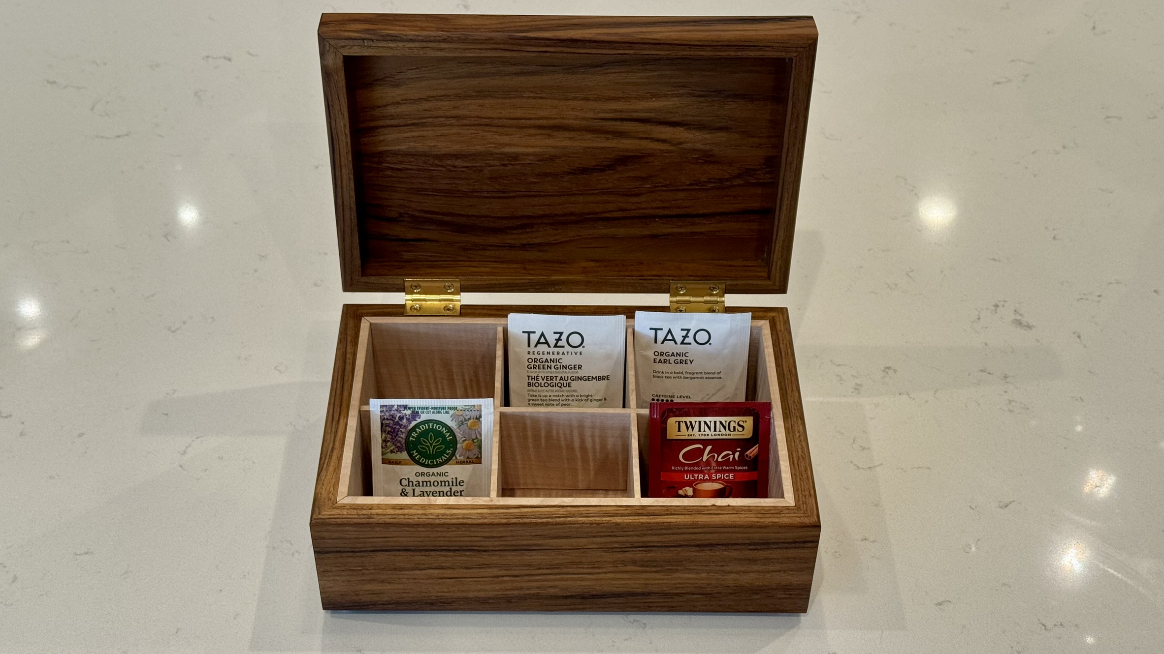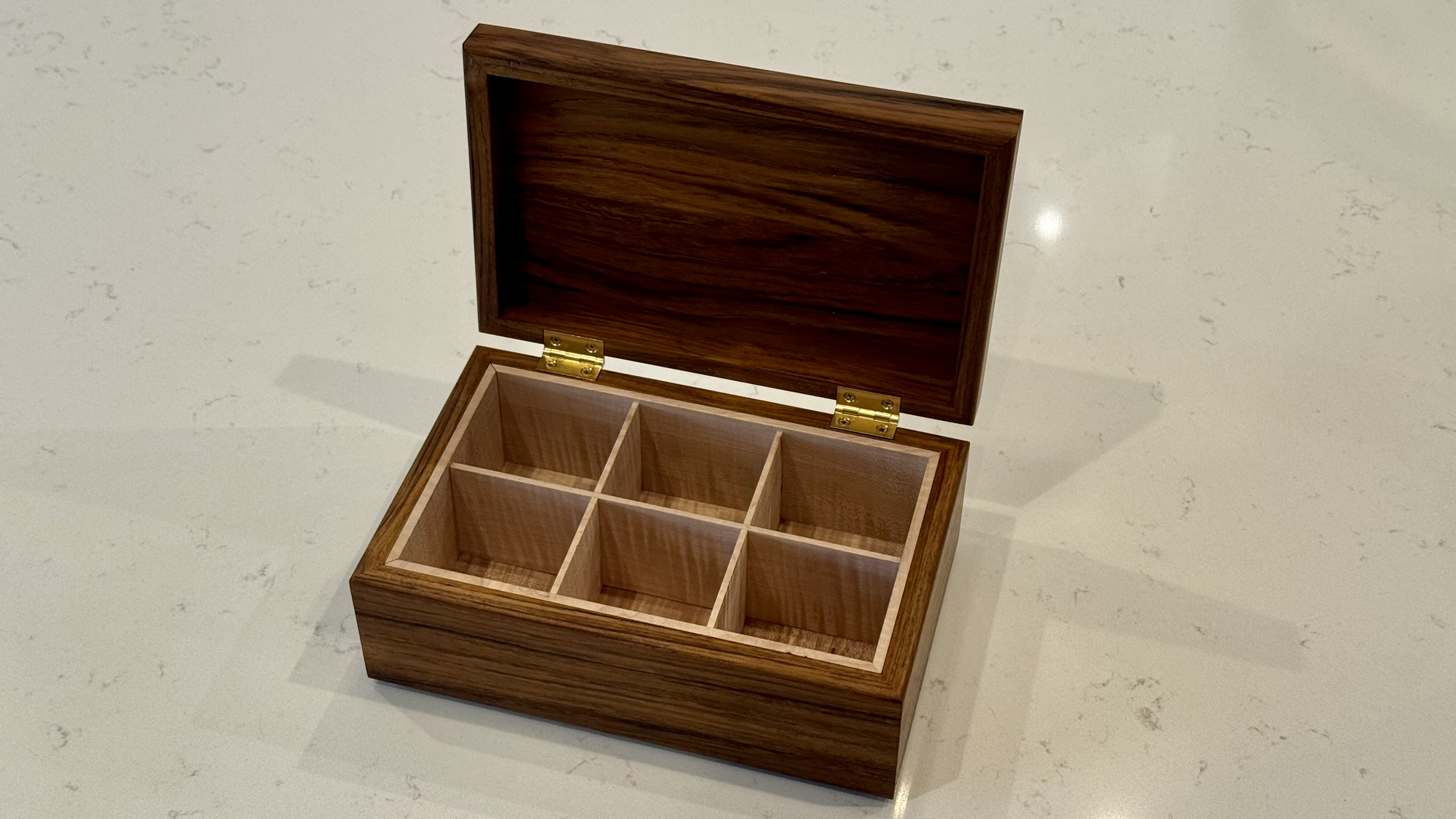 This tea box was handcrafted in my personal shop using two exceptional pieces of wood I’ve been saving for decades. The body is made from a 30-year-old slab of Hawaiian Koa—rich, warm, and full of character. The interior features curly maple that’s been in my “good wood” pile for over 25 years, chosen for its striking figure and light contrast against the Koa.